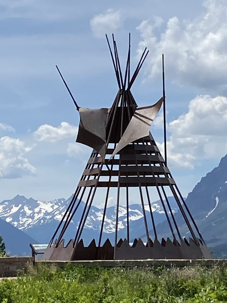 After they left (to go back to work – DO NOT miss that!), Dave and I decided to go the long way to the far side of the park – the St. Mary Visitor Center. It is a long ride. Going there we went through the Blackfeet reservation on an interesting, curvy road with some amazing vistas. Definitely happy we had Lil’ TG for that. We went up as far as we could on the Going to the Sun Road and saw Goose island and other very pretty places. On the way back to Moose Creek we decided to go the longer, but probably faster route through Browning and we saw some interesting metal work by Ed Big Beaver along the road. They were pretty cool. We also saw a moose cow and calf along the road there. That is the first time we got to see a moose this trip.