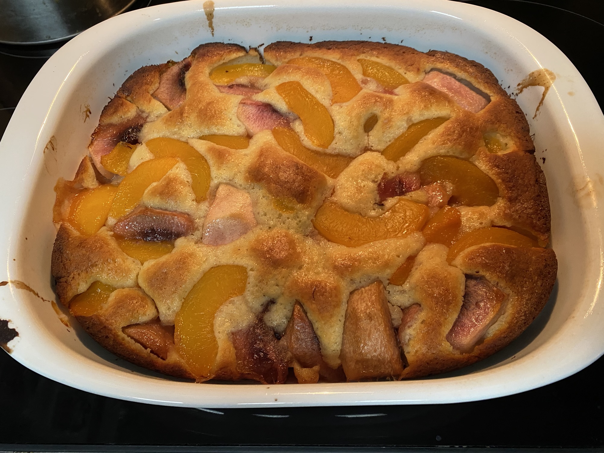 One of the weird things about cobbler is that the cake cobbler part rises above the bubbling peaches during baking. Magical!