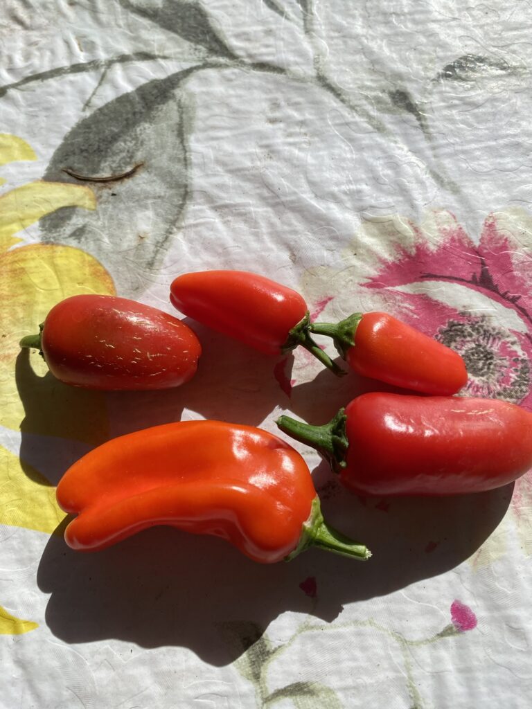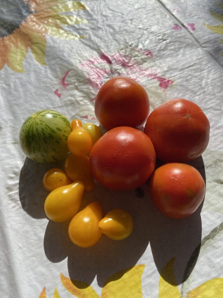 Some of the garden plants are hanging in there – the green beans have a last hurrah as do the tiny (!) pepper plants and my tomatoes. They don’t get much sun and are very scraggly plants, but they still produce. All three pepper plants are less than 12” tall! The pear tomato has regrown its branches from the bottom of the plane, and they are blooming while the green zebra and mid red tomato plants are barely hanging on but producing a fair amount of fruit. They are no longer blooming.