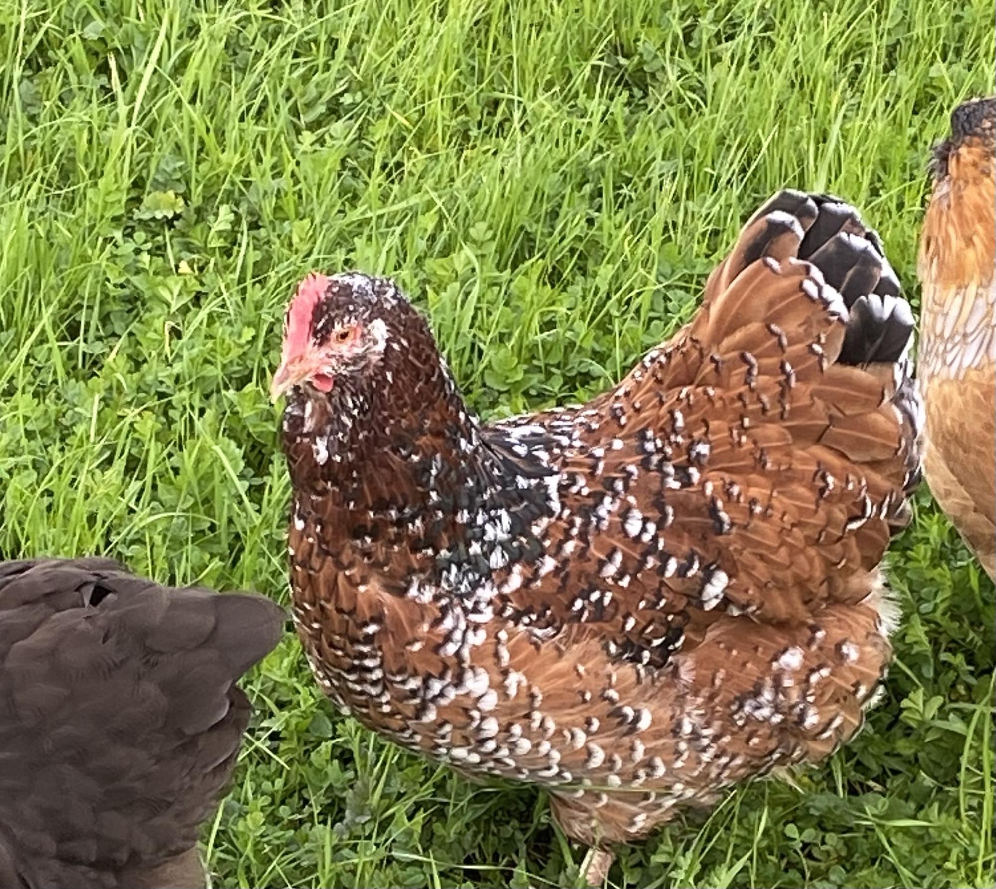 The big girls (Hermie, Enola, Vin, Emma, Charlotte and Cordelia) survived their first heat wave OK. The four Orpington are very fluffy and did look hot a few days. It got up to 90F which is a lot after being in the high 70F’s at most the week before. But we do get hotter throughout the summer so hopefully they figure out how to use the shade and cool grass better. I did throw ice cubes into the shady grass a couple times a day and I saw Hermie at least go lay on them as I left. Matt also put up an easy up over the nesting boxes to help block the sun. Emma, who acts like the fluffiest goofy lab puppy, probably suffered the most. She is super fluffy especially through her saddle area, maybe chubby, and runs around a lot. Waddles around? She comes running out of the shade the second she hears me, chirping away, so I had to be careful not to talk near the pasture unless I meant for her to come out. I might have given them a bit more cool fruit treats too to help . But now it is back to a high of 80F and they seem to have adapted. Hermie lost a lot of feathers and I thought she might be going broody but it turns out she sits in the nest box about 3 hours to lay big ol’ jumbo sized light tan eggs. Good girl. She is nowhere as fluffy as the 3 chocolate orpy girls. But still has the adorable fluffy butt!