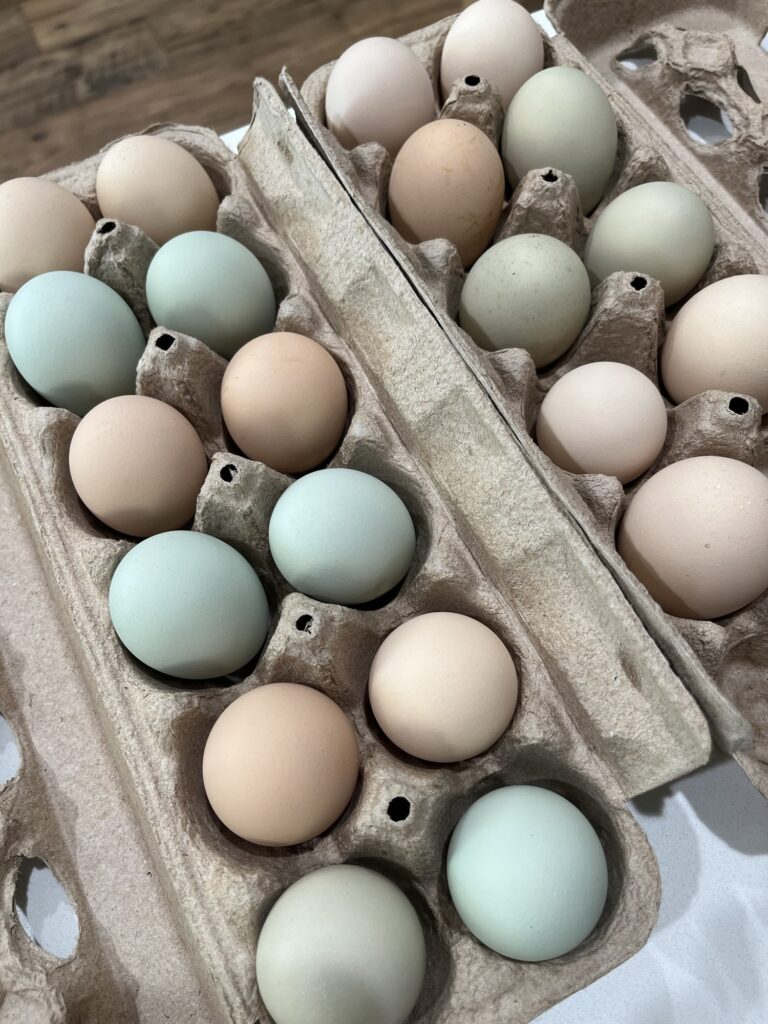 The hens are producing about 5 eggs a day right now and we are seriously talking about selling the eggs. Matt got us certified as raw egg handlers and set up a washing and storage protocol. Looks like $6/dozen pays for their feed so we will start there. Not bad for organically fed, pasture raised hens. All of the Orpington lay a brownish egg although I think Cordelia’s eggs are more creamy colored. Both Hermie and Charlotte lay big tan eggs and I think Emma is the one laying a pinkish egg. Hard to know exactly who lays which egg. With Vin laying blue eggs and Enola laying green eggs, they make a pretty carton of eggs!