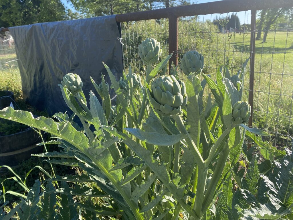 Also in the permanent garden we have the artichokes growing so many chokes, the grape stems are exploding out, the kiwi are growing inches each day and last year’s calendulas have come up everywhere. Lots of native bees and bumblebees out there. I’ve seen a couple hummingbirds too.